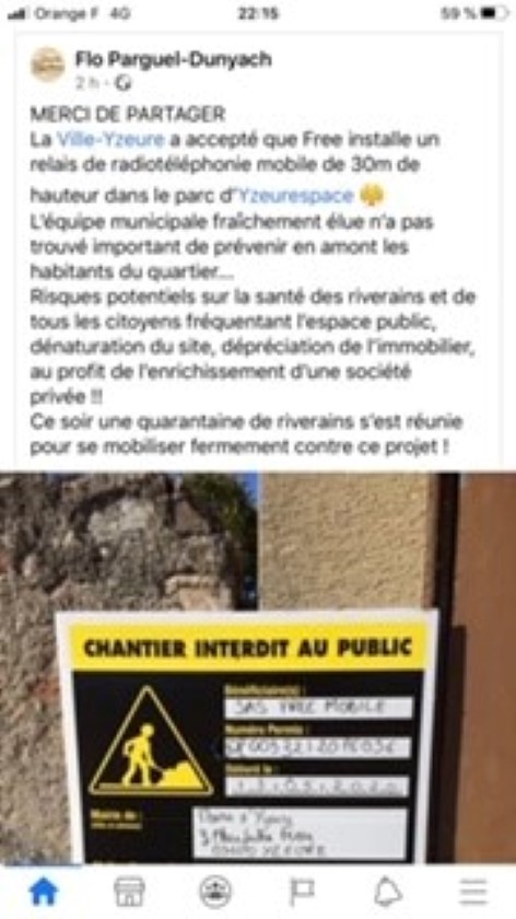 D'abord la méthode. Peut-on installer une telle antenne sans concertation ? Cette équipe municipale qui dans toutes les lignes de son programme récent prônait la concertation, n'a pas été capable de prévenir les citoyens d'Yzeure des conditions de cette installation. C'est ce qu'on appelle, sans doute une concertation en catimini ? Où sont les défenseurs de l'environnement, les conseillers de quartier, les écologistes de la liste qu'on n'entend pas, c'est à croire qu'il n'existent pas et que c'était un leurre électoral ! La social-écologie perd la tête quant aux communistes ralliés qui devenaient plus verts que rouge, ils sont devenus transparents.