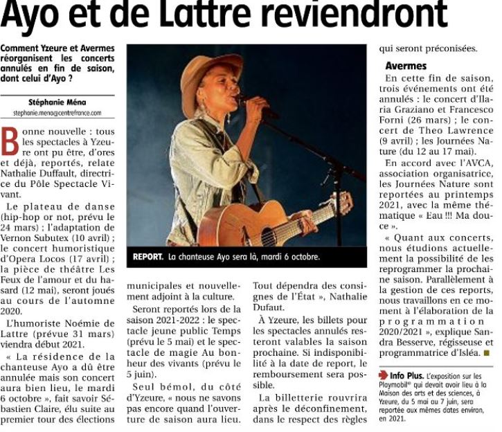 Si la crise sanitaire n'avait pas eu lieu, Ayo aurait préparé son spectacle lors d'une résidence à l'Atelier Théâtre de la Mothe à Yzeure ... (voir article ci-dessous).