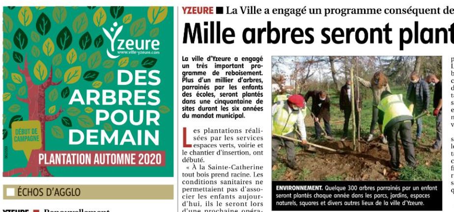 Et voilà Mme Planche n'ayant sans doute pas été convaincante, c'est le moins qu'on puisse dire, le groupe des élus majoritaires comme ils se désignent, il faut bien s'en convaincre, font appel à l'Adjointe à l'événementiel qui est obligée de sortir le grand jeu et puiser dans ses fonds sans doute. Un pavé publicitaire, très certainement payant est positionné à coté de l'article. Quelle perte d'influence de la ville d'Yzeure ! Une petite moitié de page pour 1000 arbres à Yzeure, 2 pages pour 300 arbres à Moulins ! Grillée aussi sur le calendrier ? Tout ça pour un message subliminal : "Les arbres se plantent à l'automne". Combien coûte cette plaisanterie ?