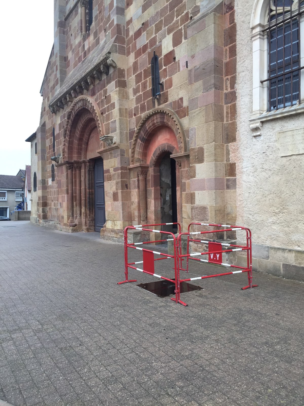 Cette barrière entoure!!!un verre protecteur fissuré ,remplacé par un panneau de bois!!!!!, d un projecteur éclairant l'église.Cet éclairage est laissé à l 'abandon ,de l' herbe pousse même à l intérieur des coffres des projecteurs.Comment peut-on ne pas entretenir cet éclairage.Le jour où il faudra leremettre cela coûtera plus beaucoup cher.Mais c'est vrai pour le moment à Yzeure on est plutôt préoccupé par l'extinction des lumières. C'est vrai que le sixième mois de présence d une barrière ,qui a pu prendre racine,mériterait une communication sur facebook.