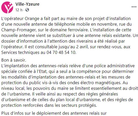 Une nouvelle antenne de Télécommunications va pousser sur Yzeure cette fois sur un terrain propriété de la SNCF. Le site ville d'Yzeure fait cette annonce. Un dossier est disponible. Nous irons le voir. On nous indique que c'est en remplacement d'une antenne existante. Mais on ne nous dit pas tout. Cette antenne verra-t-elle l'installation de la 5 G ?