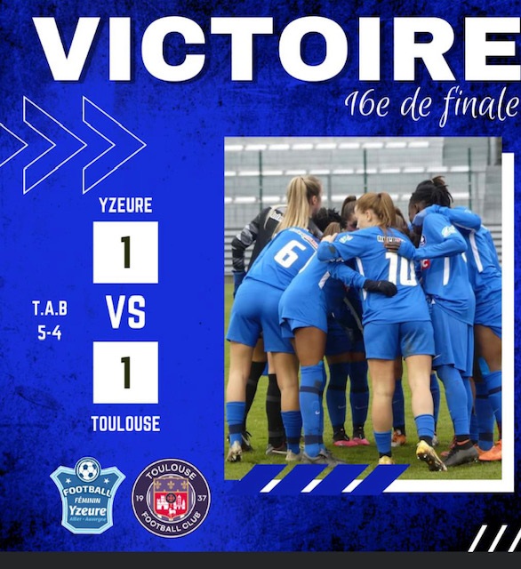 Qualification du Foot Féminin Yzeure pour les 8 èmes de finale de la Coupe de France après avoir battu Toulouse 1 -1 ( 5 tirs au but à 4 )