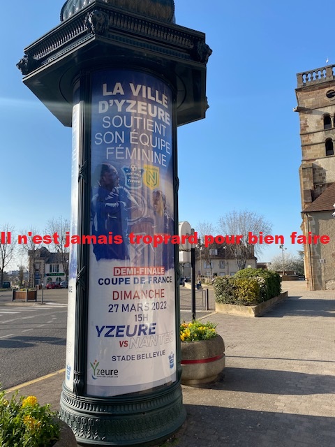 Sur la place du marché ,on disait que ,mais ce ne sont que des propos de marché ,que les conseillères municipales majoritaires  d' Yzeure prises de remords se presseraient dans les tribunes de Bellevue avec des pancartes "oui à l'égalité hommes femmes "pour faire acte de contrition ou d' attrition "pour ne pas avoir voté pour une augmentation de la subvention .
