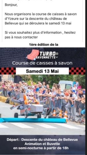 En effet,l e 13 mai 2023 une course de " Caisses  à savons " sera organisée mais oui dans la descente du Château de Bellevue à Yzeure ! Venez nombreux !