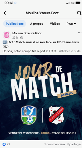 Quelle ne fut pas ma surprise de découvrir sur Facebook vendredi en fin d’ après- midi une affiche informatique pour un match amical entre Chamalières N2 et le MYF N3 .Ce match après une journée de pluie diluvienne était prévu au stade de Bellevue à Yzeure ,devinez à quelle heure 20 heures oui 20h!!!!!! Il n’ y a jamais eu de match à 20h à Yzeure même au temps où l’électricité était beaucoup moins chère Nous savons que ce match a eu lieu car les projecteurs étaient largement éclairés.