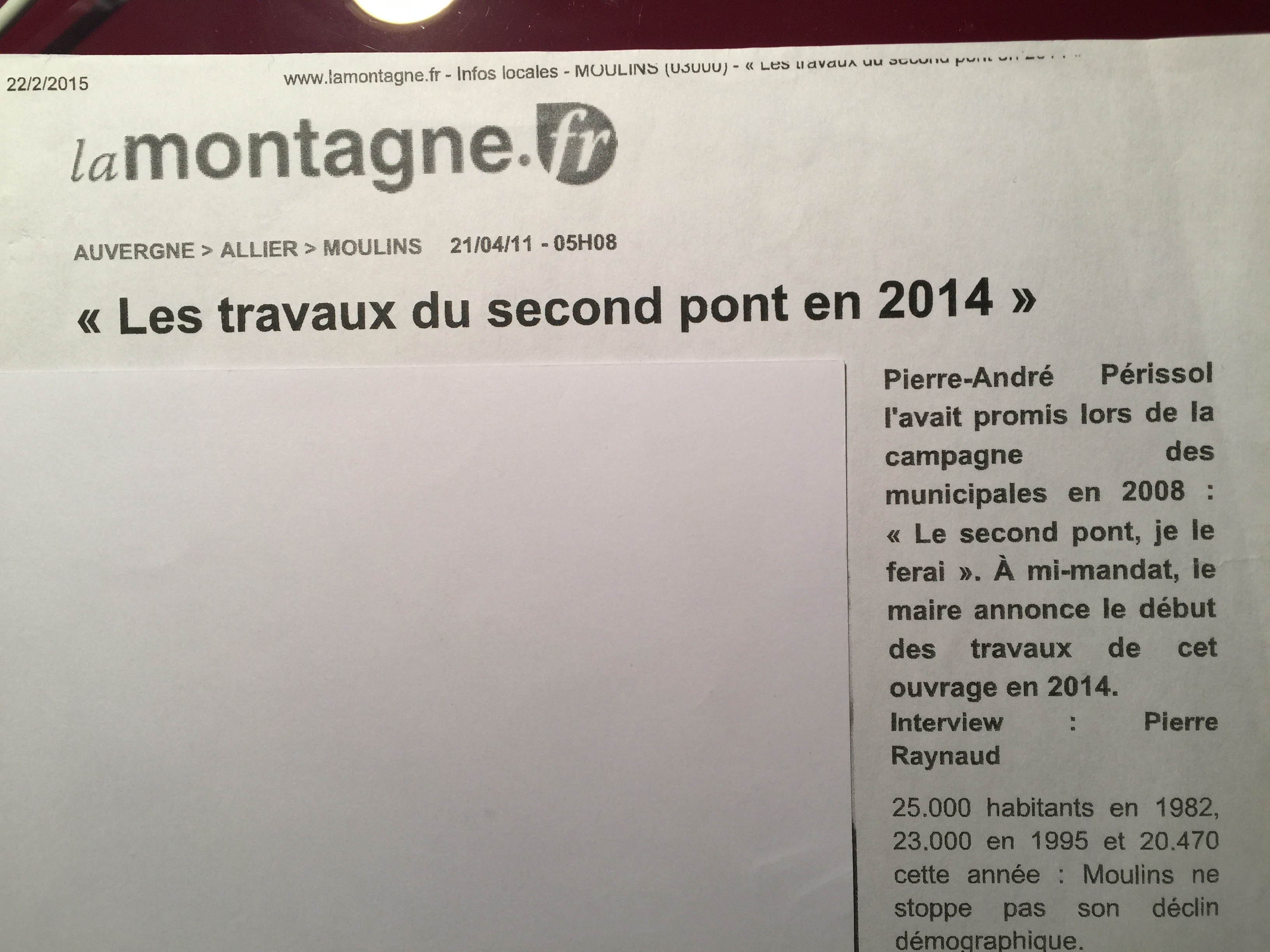 Rappelons que le maire de Moulins avait relancé le projet lors de la campagne des élections municipales de 2008 ! Vous lisez bien 2008 (il n'y a pas d'erreur de frappe) Voir notre photo : Les travaux devaient commencer en 2014.