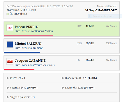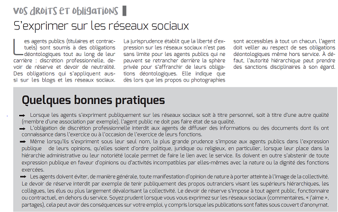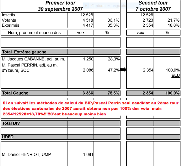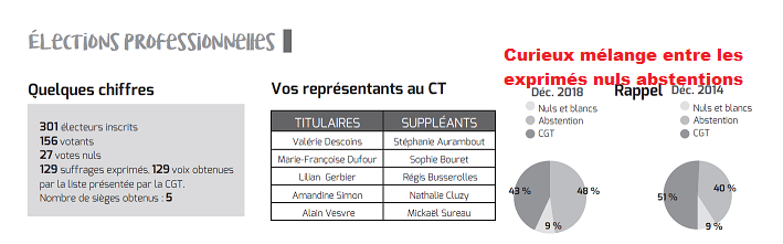 Si le Figaro avait présenté les résultats comme sur le BIP la liste conduite par Pascal Perrin aurait obtenu 2659 / 9623 = 27,63 % au lieu de 42,61 % ce n'est pas la même chose. Il ne peut pas s'agir d'une erreur. La comparaison sur les mêmes bases avec 2014 n'est pas sans arrières pensées. Il est vrai que dans un autre article sur lequel nous reviendrons d'ailleurs car il est étonnant, il est indiqué que les agents n'ont pas le droit de critiquer hiérarchie et élus sur les réseaux sociaux. Pourtant là ce serait justifié. Vous devriez savoir Mesdames, Messieurs que le pourcentage de voix pour être élu se calcule en fonction des suffrages exprimés. Et si ce n'était pas une erreur ? Un rectificatif devra être fait dans le prochain BIP.