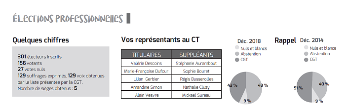 Ont obtenu : liste présentée par la CGT : 129 voix soit 100 %. Nombre de sièges obtenus 5.