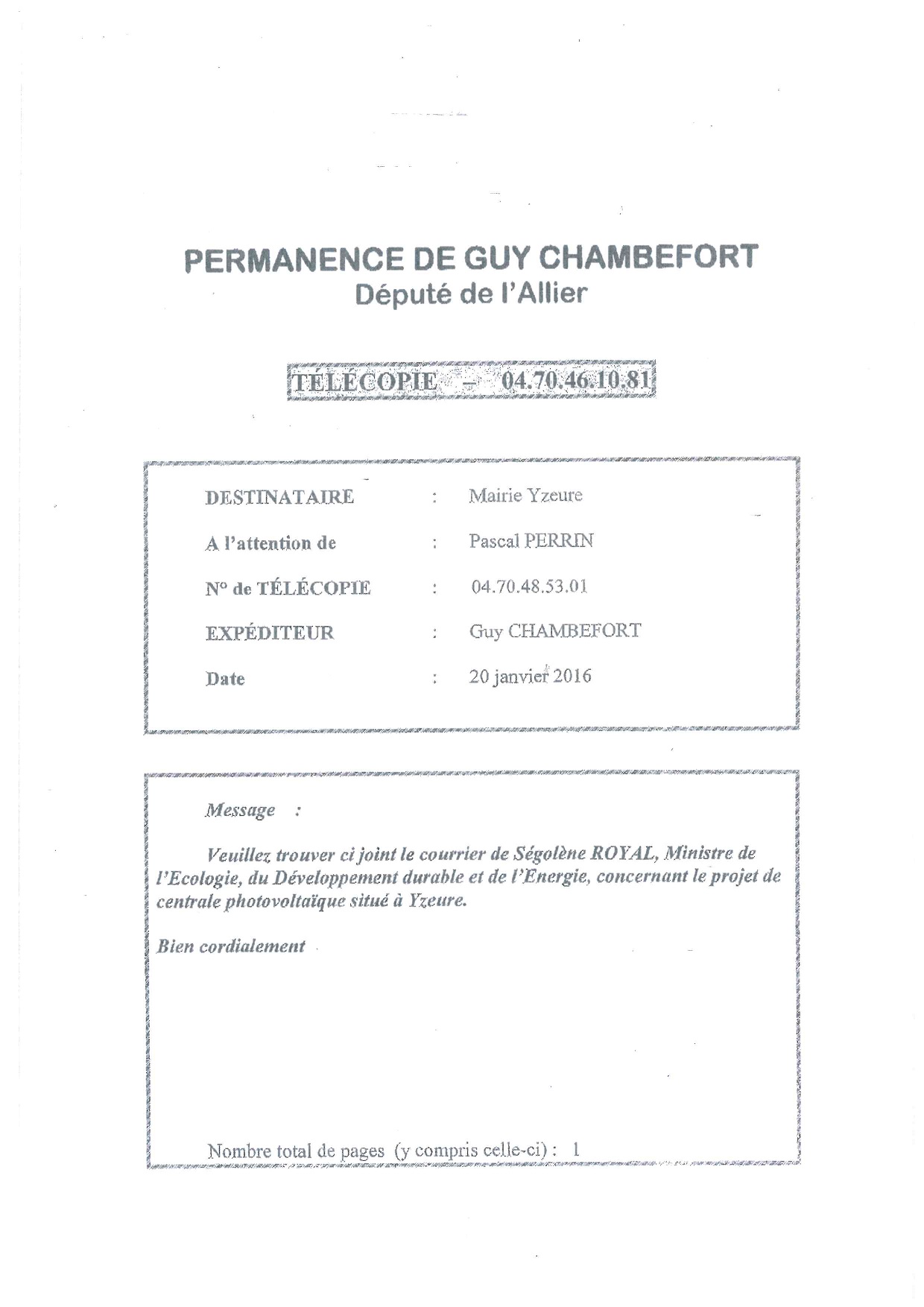 Le Conseil municipal en mai 2015 confirme simultanément la promesse de bail emphytéotique à Photosol en vue de de la construction de la centrale photovoltaïque. Mais il restait à obtenir l'accord de la Ministre de l'écologie et du Développement durable et de l'Energie Ségolène Royal. J’ai effectué comme député, de nombreuses démarches pour que trois projets (Yzeure Bessay Chézy : voir courrier) soient inclus dans l'appel d’offres lancé en novembre 2014 par la ministre afin d'appliquer rapidement la loi de transition énergétique. Il faut rappeler que la précédente ministre n'avait pas retenu notre territoire pour ce type d'implantation. Malgré un avis défavorable assez inexplicable du Commissaire enquêteur, le Préfet accordait après de nouvelles démarches nationales et locales le permis de construire. La centrale a été construite entre août 2017 et février 2018 où elle a été raccordée au réseau. Elle a été inaugurée le 24 septembre en présence du Maire d'Yzeure (pièces jointes : le courrier de Ségolène Royal au Député)
