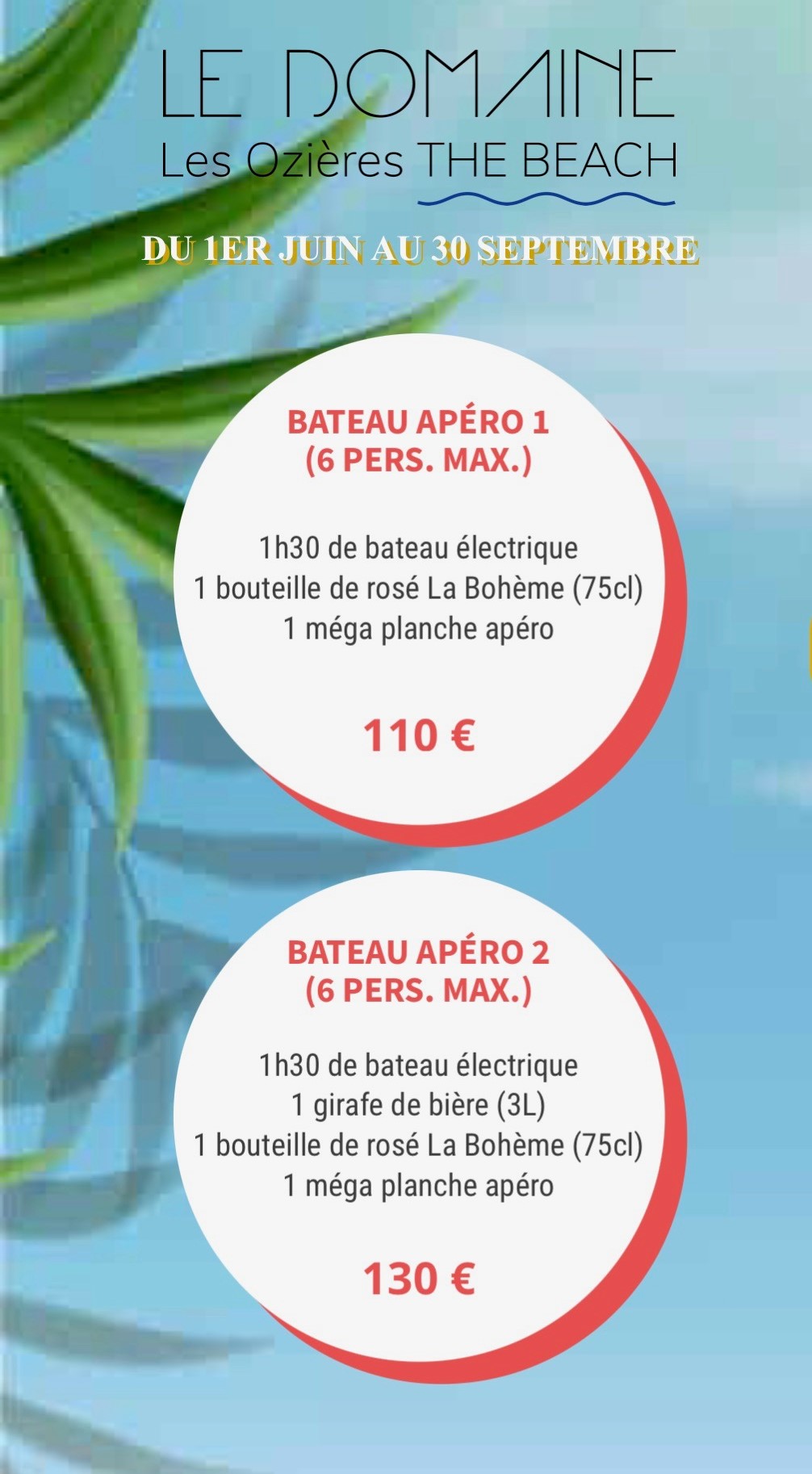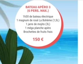On pourra constater que deux bateaux électriques vogueront sur le plan d'eau, appelés bateaux "apéro" aux tarifs étonnants de 110€, 130€, 150 € pour six personnes.