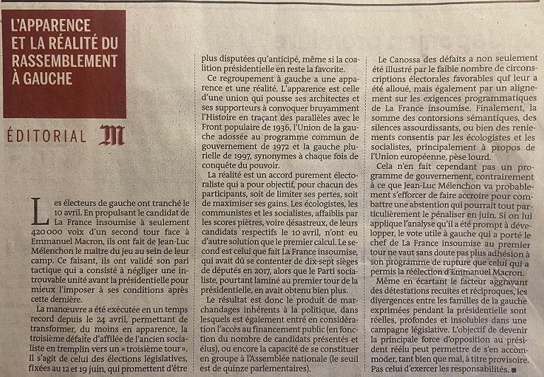 En politique, la défaite n’explique pas tout ni ne peut tout justifier. Les actuels dirigeants du Parti socialiste ont engagé, sans consultation des adhérents, une négociation avec la France insoumise en vue des élections législatives. Alors que le parti de Jean-Luc Mélenchon a combattu sans répit le Parti socialiste, lorsqu’il gouvernait comme lorsqu’il ne gouvernait plus, qu’entre les deux formations ni les valeurs ni les moyens d’action ne sont communs, les négociateurs socialistes ne verraient désormais entre elles « aucun point insurmontable ». Quelques heures auraient ainsi suffi à oublier les divergences les plus fondamentales, ou plutôt à les taire.