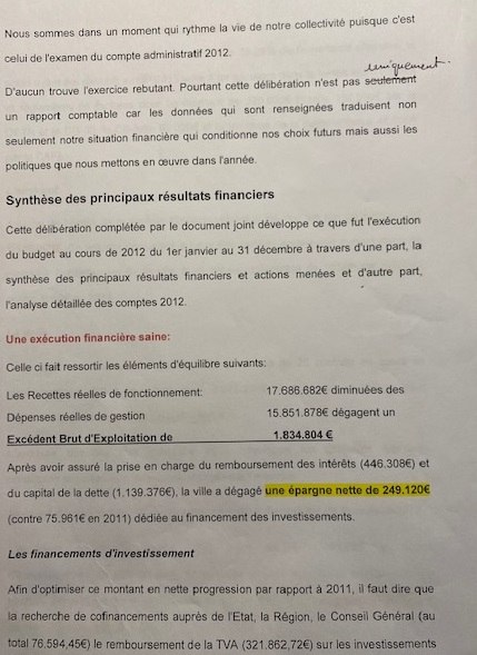 Mais bon ! Marie Lacquit, quand on connait le peu d'habitude de la Chambre des Comptes à distiller des compliments, reconnaissez que ce que vous appelez "l'ère Chambefort" et ses associés de l'époque a eu droit à quelques compliments !!!! Et quand vous verrez que la valeur du patrimoine, (nous aurons l'occasion d'en reparler), est bien supérieure à la dette vous serez un peu surprise ! Espérons que les choses se poursuivent de cette façon à l'avenir mais c'est une autre histoire ou une autre ère si vous voulez. Mais nous ne laisserons pas dire n'importe quoi !