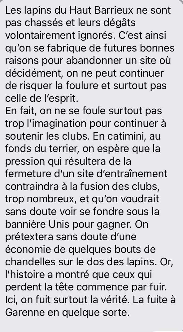 Et pendant ce temps les lapins créent leurs terriers sur le stade du Haut -Barrieux gênant les matches (refrain)