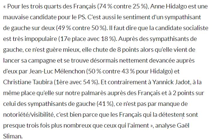Et comment voulez vous qu'  Anne Hidalgo gagne des voix ? A Moulins Yzeure les distributeurs de tracts de soutien étaient les secrétaires de sections de Moulins  et Yzeure  Jean -Michel Bourgeot et Thomas Duret bien esseulés, qui ont fait fuir depuis des mois, des années ,les militants des sections : une quatorzaine de votants à Yzeure et une septaine à Moulins . A force en plus d'exclure ils se retrouvent  seuls.