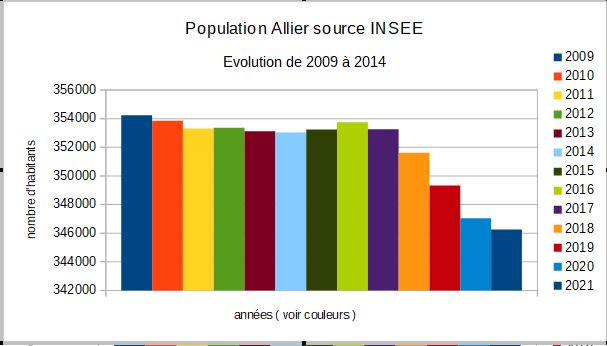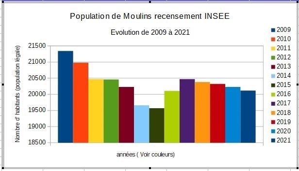 La ville de Moulins, qui monopolise une grande partie des ressources de la Communauté, n'en tire aucun avantage sur le plan démographique. Ainsi en 2016 la population était de 20 321 h, 20 227 h en 2017, 20 117 en 2018. Il faut rappeler que Moulins avait 22 667 h en 1999 ; le Maire actuel était là. Il n'y a bien que le quotidien local qui trouve que la population de Moulins se maintient.
