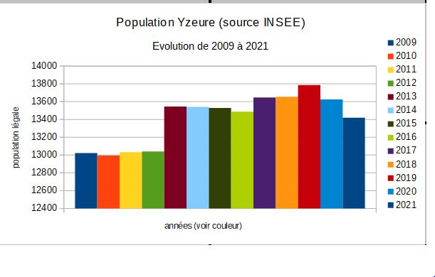 Yzeure après avoir progressée jusqu'à 13 787 h en 2017 redescend à 13 419 h en 2018. Yzeure avait 13 262h en 1999. On peut penser que ce phénomène se poursuivra car aucun logement social n'a été construit à Yzeure entre 2014 et 2020 ; on constate également une baisse des effectifs dans les écoles qui risque d'être importante à la rentrée.