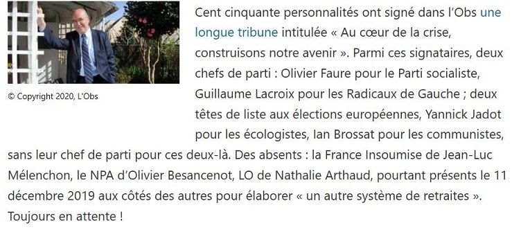 Cette initiative intervient dans un contexte de crise sanitaire et déjà économique et sociale. Sur le plan politique, elle est à rapprocher de celle de Nicolas Hulot et des 200 signataires « people » de son texte « 100 principes pour un nouveau monde » que le Monde a publié en lui offrant 5 pages du journal. Du jamais vu à ma connaissance. Elle est prolongée par la tentative de son ami et complice Mathieu Orphelin de constituer un 9ème groupe parlementaire à l’Assemblée Nationale. La tribune de l’Obs est différente, signée par des acteurs politiques mais on sent poindre quelques ambitions du côté de Yannick Jadot, député européen, et d’Eric Piolle, maire de Grenoble. L’un et l’autre se voient en chantre d’une Gauche unie, reléguant PS, PC, PRG au rôle de supplétifs. Science-fiction ? Pronostic hasardeux ? Analyse tordue ? Mais comme aime le dire François Hollande : « Rien ne se passe jamais comme prévu ». C’est rassurant !