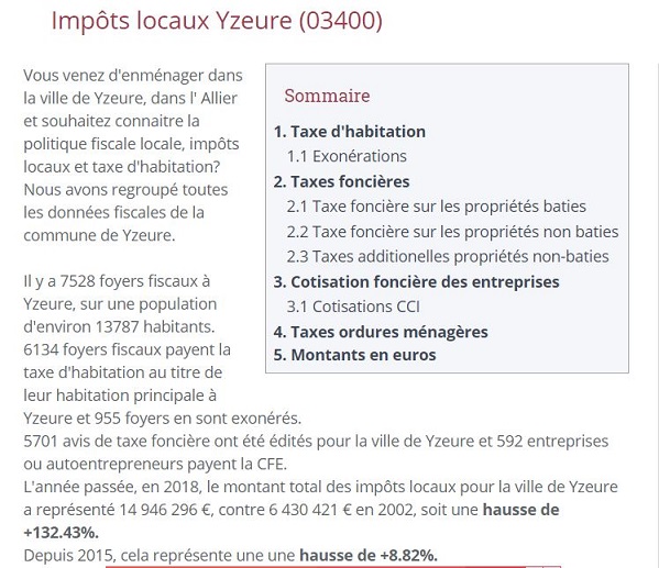 Même chose à Yzeure ou le montant des impôts locaux payés par les Yzeuriens a progressé de 6 400 000 euros à 14 940 000 (132 ,43%).