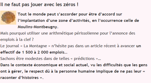 Et puis quand on parle de mettre 100 millions, se moquant des citoyens, pour l'aménagement des berges de l'Allier à Moulins, il faudrait que les élus se déplacent pour voir comment sont aménagés avec simplicité les remarquables points d'observations et les chemins naturels sur la rivière Allier sans dépenser beaucoup d'argent (et on ne leur demandera pas de se déplacer en chavans, pourtant ça ferait une belle photo !).