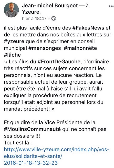 Les termes utilisés contre les élus du Front de gauche sont inadmissibles et je les condamne de la manière la plus ferme : mensonges, malhonnête, lâche !!!!!! L'adjoint concerné doit s'excuser, les retirer ou démissionner. J'ai pour ma part beaucoup travaillé aussi bien à Yzeure, qu'au Département avec les communistes. Nous n'avons pas toujours été d'accord. Parfois les débats étaient rudes, c'est ça la démocratie, mais je ne peux pas admettre qu'on utilise de tels qualificatifs à leur égard. Je ne peux l'admettre de quelqu'un qui a figuré dans le passé sur une liste de gauche. Il critique les procédures de recrutement du mandat précédent. A l'époque, l'adjoint au Personnel a fait parfaitement son travail. Et si l'adjoint au personnel du début de mandat actuel a quelque chose à dire qu'il s'adresse à l'ancien maire. Celui-ci n'avait jamais entendu, de la part de l'adjoint à l'époque de remarques, c'est quand même étonnant. Le maire d'avant 2014 lui répondra, depuis le quai, qu'il n'y a pas eu pendant ses 25 ans de mandat de remarques, ni de la Préfecture, ni de la Chambre des Régionale des Comptes dans la gestion du personnel. C'est moins vrai actuellement avec le régime indemnitaire critiqué par tous même par la Préfecture. C'est vrai qu'a l'époque on n'avait pas fait appel au vivier du Centre Hospitalier pour recruter dès les lendemains de l'élection, on avait banni les recrutements familiaux, les recrutements curieux comme par exemple ceux du service informatique (agents non diplômés dans la discipline (sur quels critères ?), n'ayant été reçu à aucun concours, et pour un adepte des réseaux sociaux pour diffuser des tracts racistes). Si c'est ce qu'on nous vante comme un modèle à suivre du haut du bastingage ! Non merci. Il s'en prend à la Vice-présidente de la Communauté d'agglomération qui ne connaitrait pas ses dossiers. Qu'elle ne fut pas ma surprise en suivant les conseils du donneur de leçons d'entendre que le Maire actuel lui-même avouait, pendant le Conseil municipal, qu'il ne comprenait pas tout le contenu de la délibération proposée par Moulins Communauté. C'est curieux quand on est maire ou premier adjoint on ne met pas à l'ordre du jour des délibérations incompréhensibles. On adopterait les délibérations sans les comprendre proposées par le Président ? Et puis qui fait partie et fréquente régulièrement, je suppose, la Commission d'administration générale de la Communauté d'Agglomération ? Quand on veut se draper en donneurs de leçons, il faut d'abord lire Gaarder : "Ces donneurs de leçons qui sont parfaitement satisfaits du peu qu'ils savent, se vantent de tas de choses dont ils n'ont, en réalité, pas la moindre idée".